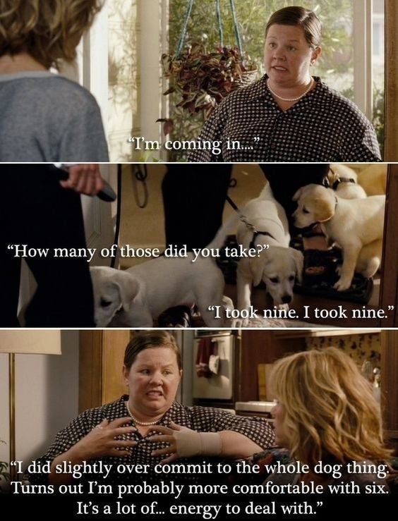 Three jobs was excessive. I’m reminded of that scene in Bridesmaids when Megan, played by Melissa McCarthy, acknowledges that, after taking on nine puppies, “I did slightly overcommit to the whole dog thing. Turns out I’m probably more comfortable with six.”