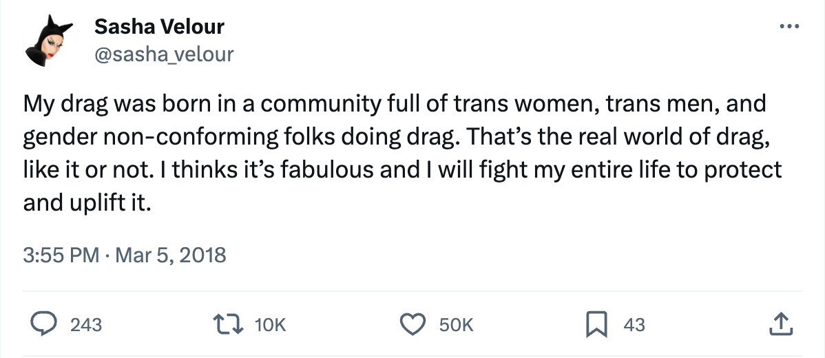 As the then-reigning winner of Drag Race, Sasha Velour, put it in a response to RuPaul’s comments, “my drag was born in a community full of trans women, trans men, and gender non-conforming folks doing drag. That’s the real world of drag, like it or not.” Here, Velour points to the fallacy of RuPaul, the paragon of drag, and Drag Race, which is supposed to represent a compendium of the art form of drag, not including trans women on their show. Put another way, Drag Race cannot represent the full breadth of US (and, later, transnational) drag communities without featuring trans women.