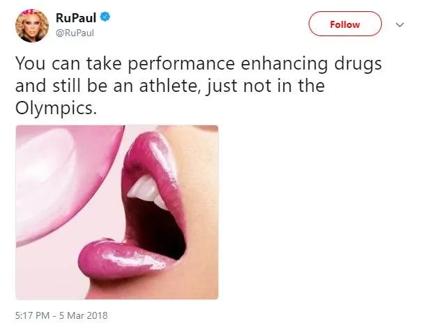 The rhetorical choice of “performance enhancing drugs” remains fascinating to me. This phrase, specifically when considered alongside the comments RuPaul made about Peppermint’s breast implants, reads as very careless for someone who, from Aitkenhead’s perspective, “doesn’t want to offend anyone.”8 To compare “performance enhancing drugs,” a phrase with negative and nefarious connotations, to Peppermint’s body modification, the only modification brought up by RuPaul, specifically, her comments can be read as ascribing that same negativity to gender affirming care. Even if RuPaul does it indirectly, conflating the two creates this idea that a Drag Race contestant getting a breast augmentation would be considered cheating in the same way that a cyclist taking steroids is considered cheating. Now, do I believe RuPaul was intentionally trying to cast aspersions on gender affirming care? No. However, there’s a difference between intent and impact, and this article is almost singularly concerned with impact.