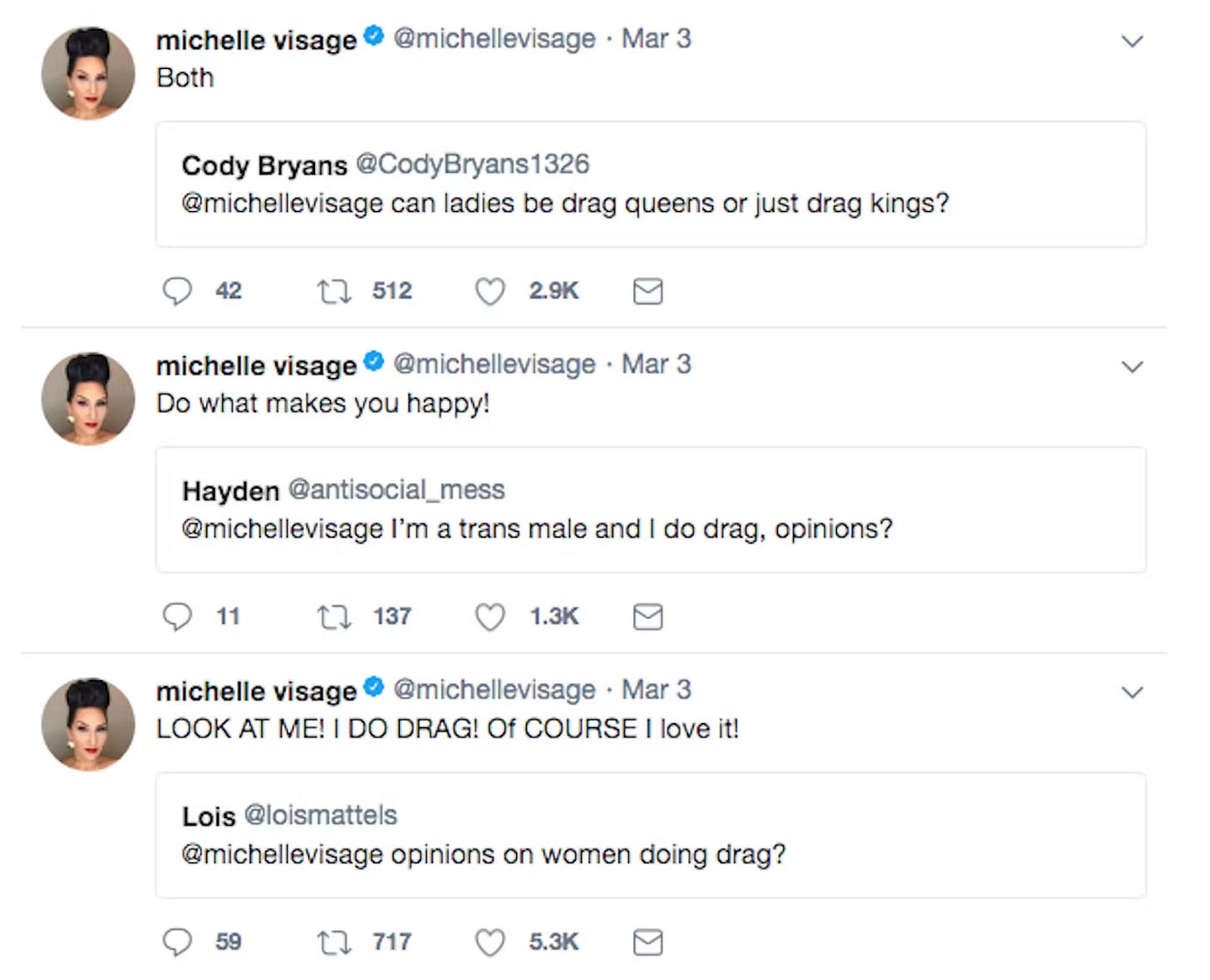 RuPaul’s comments from the passage above, in particular, about excluding trans women immediately kicked off a firestorm. Similarly to Sasha Velour, dozens of former Drag Race contestants came out to disavow RuPaul’s comments. Even Michelle Visage, RuPaul’s right-hand on Drag Race and real life best friend, stated her disagreements with RuPaul on this matter.