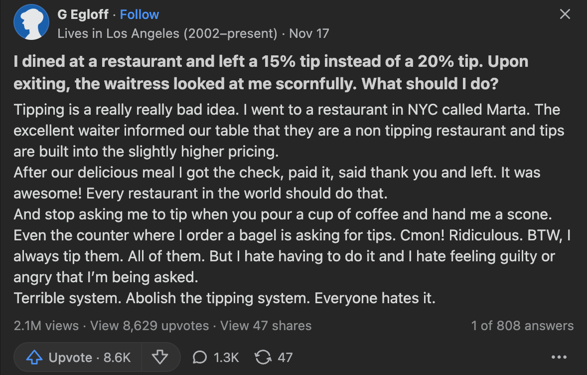 Now, these kinds of attitudes are much more prevalent when it comes to tipping counter service workers. However, they also exist in leaving gratuities for servers or bartenders. Take this post on Quora, a popular question and answer website, for an example: